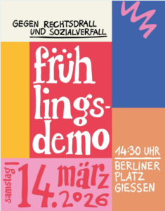 Um 14:30 Uhr findet auf dem Berliner Platz in Gießen eine Demo gegen Rechtsdrall und Sozialverfall statt,